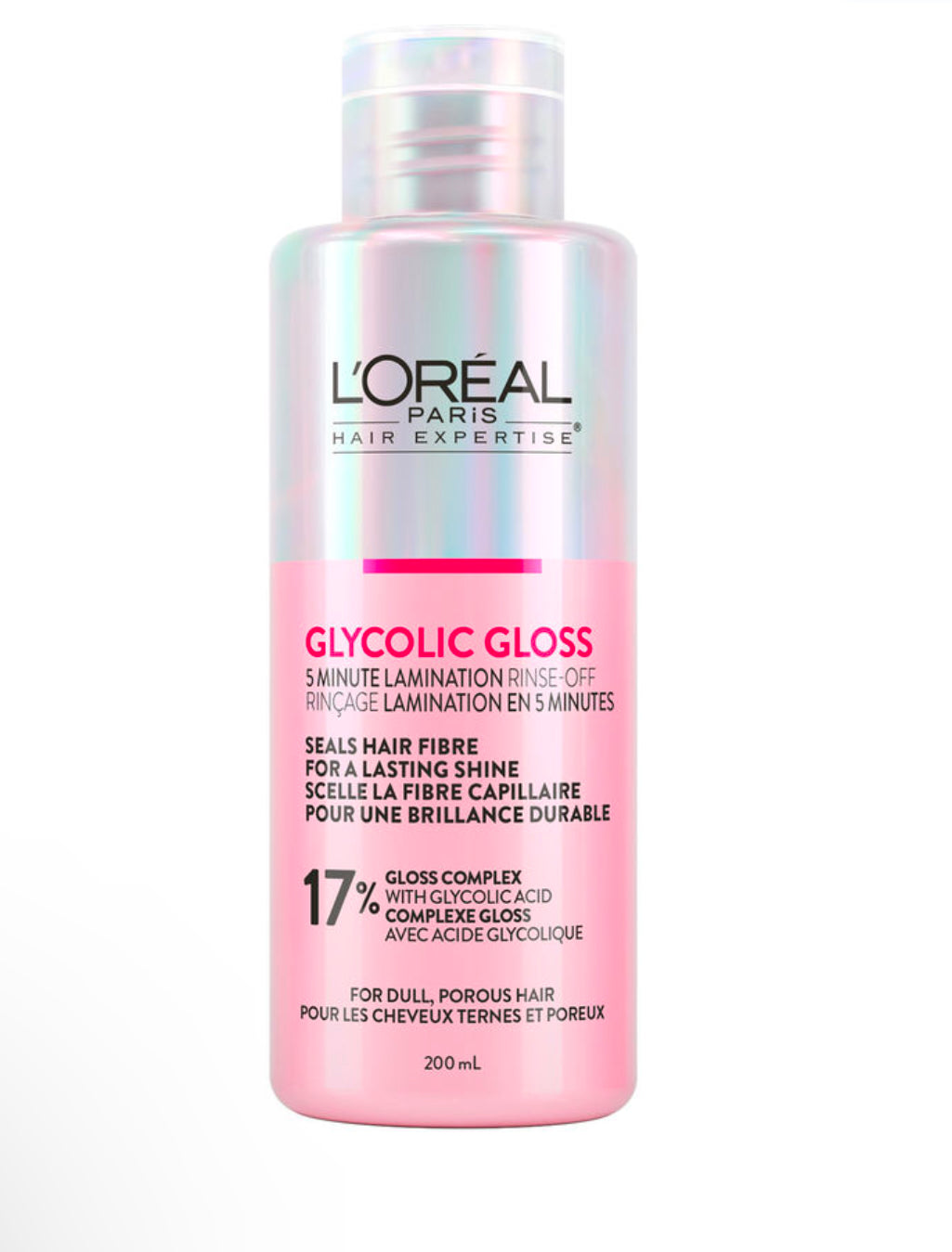 L'Oréal Paris Hair Expertise Glycolic Gloss 5 Minutes Lamination Glossing Treatment. This lamination treatment, also known as a glossing treatment, is powered by a 17% Glycolic Acid Gloss Complex that penetrates deeply into the hair fiber to improve hair quality and seal cuticles with a lasting glossy effect. Perfect for dull, porous hair, this lamination treatment transforms your hair in just 5 minutes, leaving it 2x shinier and 88% smoother for up to 10 washes.