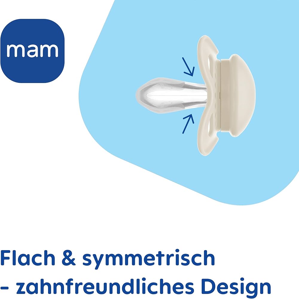 MAM Original Dummy in set of 2, teeth-friendly baby dummy made of sustainable and organic renewable materials, MAM SkinSoft silicone teat with baby pacifier box, 0-6 months, blue/beige