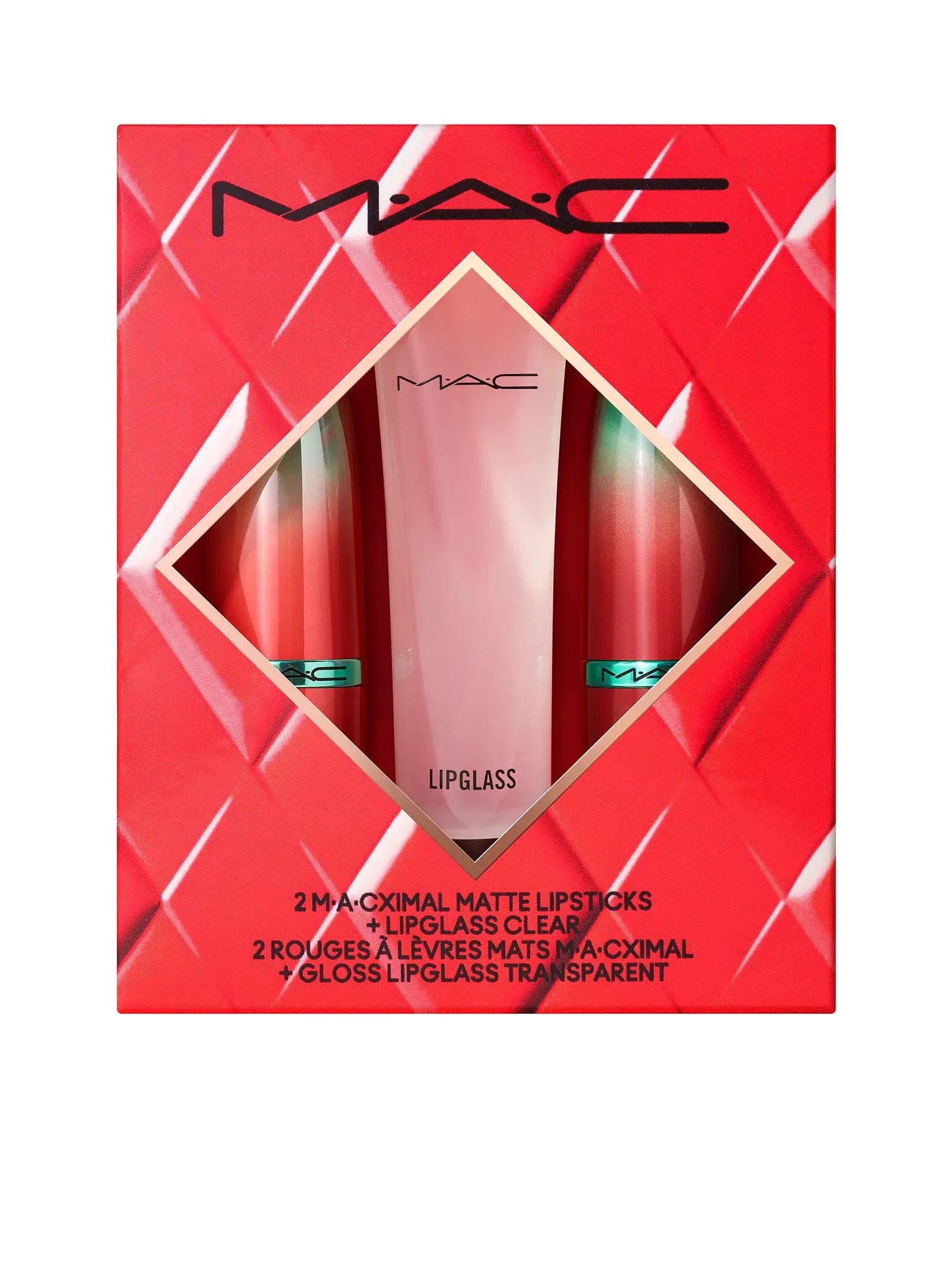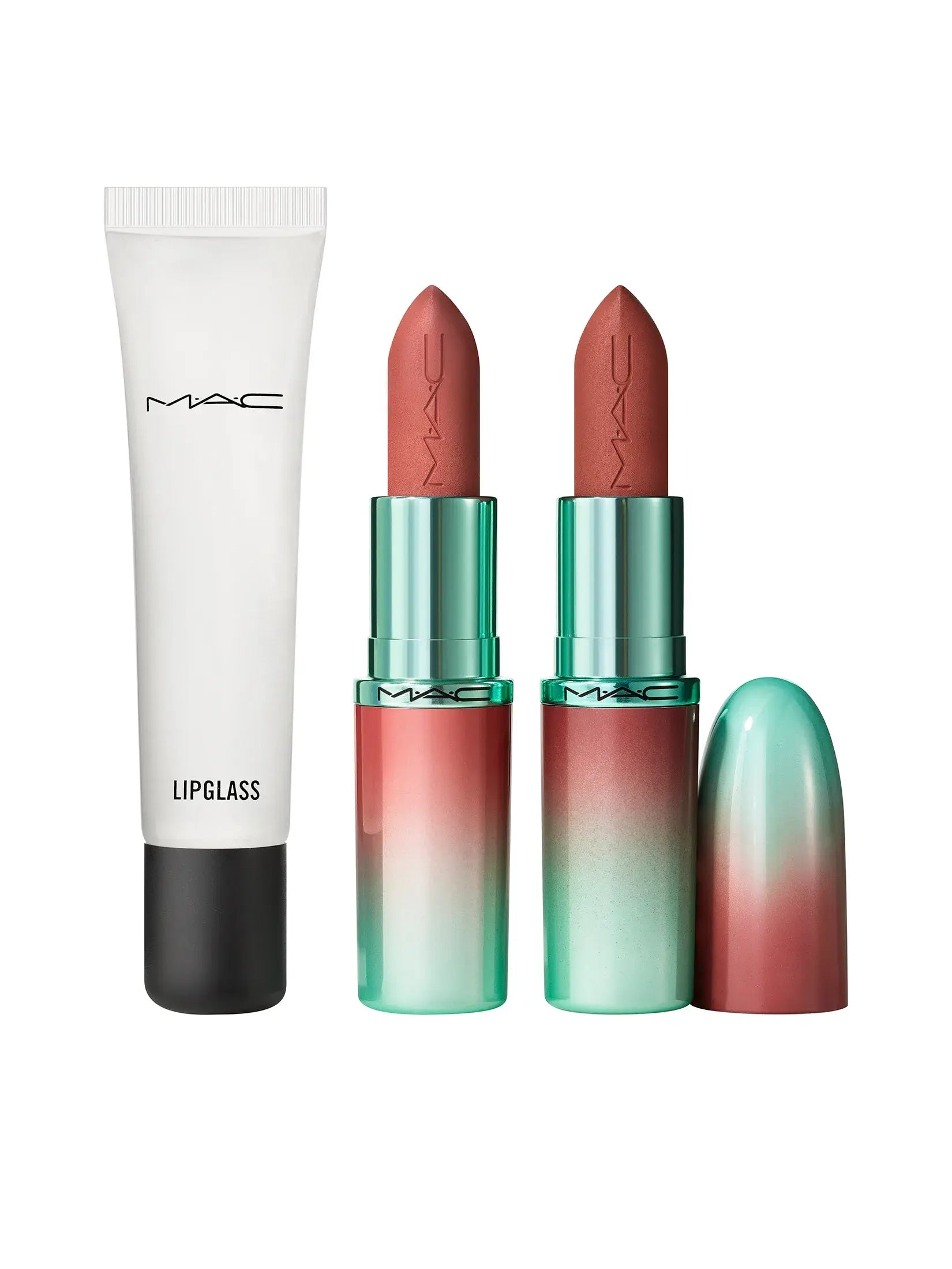 A holiday-exclusive gift set for lips featuring full-sized M·A·Cximal Silky Matte Lipstick in two best-selling shades and Lipglass Clear at a M·A·Cnificent value from MAC. Turn the minimalist into a M·A·Cximalist this holiday season. This giftable lip trio features two full-sized best-selling neutral hues of M·A·Cximmal Silky Matte Lipstick in Velvet Teddy and Whirl, plus full-sized Lipglass Clear. M·A·Cximal Silky Matte Lipstick delivers 12 hours of full-coverage colour and eight hours of moisture. Lipglass Clear is a unique lip gloss that can be layered for a glass-like finish or subtle sheen. Ready to gift in holiday-exclusive packaging at a M·A·Cnificent value.